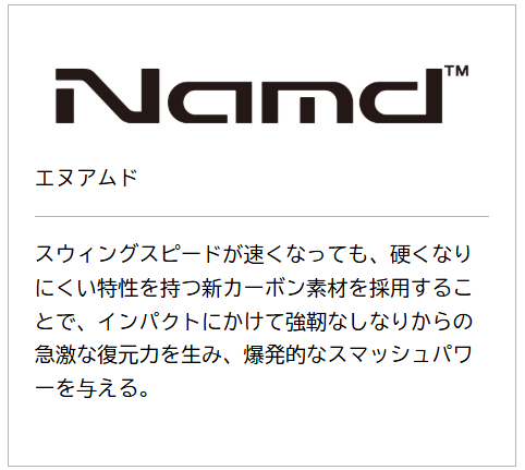 Namd™をシャフトとフレームに搭載し、素早いしなりと戻りで球持ちと球離れを向上させています