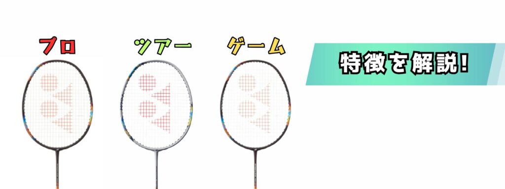 ヨネックスのラケットには、同じ名前のラケットでもPRO(プロ)、TOUR(ツアー)、GAME(ゲーム)といった種類があります